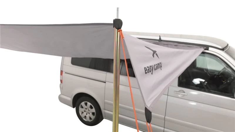 The Easy Camp Canopy gives you an extra bit of shelter for your campervan. The Canopy is perfect for short trips away or just for a couple of hours as it really is so easy to pitch and pack away. It can be either fed into a rail or extra guyropes can be thrown over the top of the van and pegged on the other side. Two steel upright poles come as standard and the spike goes through an eyelet on the canopy to secure it. Two guylines can be placed over the top and help to tension the canopy away from the van.