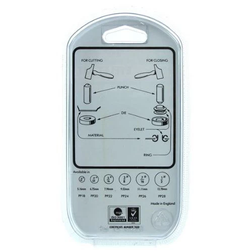 Brass eyelet kit from Hipkiss. Punch and die brass eyelet and rings, as well as the fixing tool required.