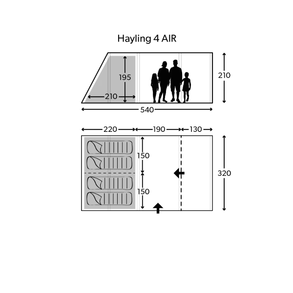 It sleeps up to 4 and offers a large living area, with a great view through panoramic windows. Very quick to set up, the Hayling 4 AIR is great for long or short stays and is ideal for touring. The bedrooms feature a zipped partition between the compartments that can be rolled up to make one large bedroom. The living room has a sewn in groundsheet and a large door in the left hand side with a mesh screen panel to keep the bugs out on warm days.