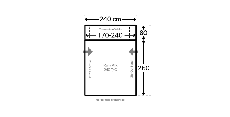 The Rally Air Pro T/G has been purpose-built to fit onto a panel van conversion with rear barn doors, the tunnel has a uniquely designed adjustable system without any Kador meaning the material can fit snuggly around the roof and side of the vehicle. Webbing & pulley straps help the tunnel to take shape and stop the elements from coming into the awning while longer straps stretch to the front of the van. Two red oversized hooks clip onto the wheel arch either side to pull the tunnel sides close to the bodywork.