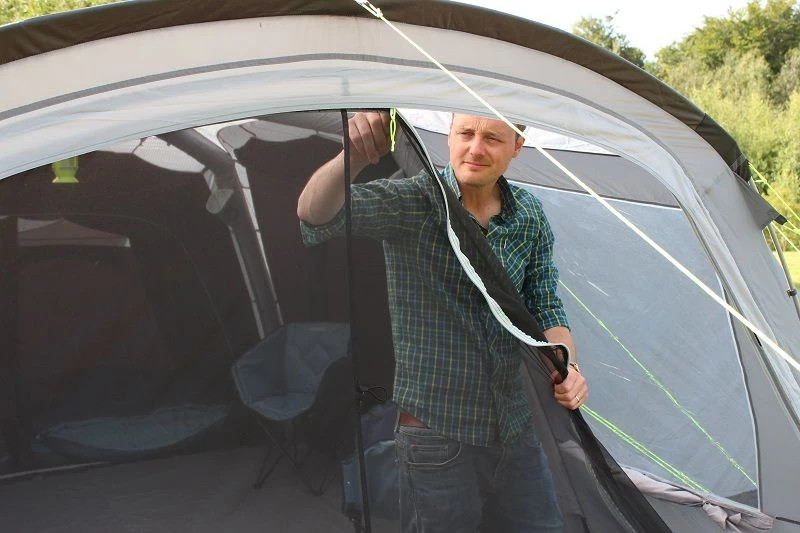 The Outdoor Revolution Camp Star 1200 is very unique as it gives you the sleeping space of a traditional dome tent without the hassle of pitching it, nor the eyewatering price. The Camp Star 1200 is really quite clever as it is more of a hybrid tent combining the quick and ease of air but the simplicity of poles to make a big but incredible value. The Podded Dome style helps to give each group their own sleeping space away from one another, this is ideal for larger families with older kids. The tent has three spacious zones so you can comfortably accommodate a have everybody inside on those rainy days thanks to an amply sized sleeping, living and enclosed front awning area. Each sleeping pod has a toggled divider so you can make it a cosy four-berth bedroom with privacy or a master bedroom fit for any couple. Outdoor Rev has stated that it is a 12 person tent, which would be in fairness quite generous but in our opinion, it almost lends itself to be the ultimate 6/8 berth tent. The tent is brand new for the 2021 season and makes buying an inflatable tent more affordable, it offers all the main features that you need but without compromising on quality. The built-in front awning offers that sheltered area away from the elements, keeping all of your shoes, bikes or cooking equipment clean and dry.