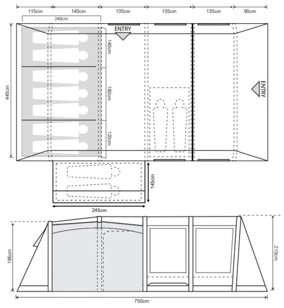 Large Dimond Clear PVC windows are positioned around the tent to make the tent feel nice and light while toggle up curtains can be used for additional privacy when needed. Darkened Twilight bedrooms help to cut out early morning light and, hopefully, allows the kids to sleep in a bit longer than expected! The biggest selling point of the Camp Star has to be the two double-sized annexes, which allow you to sleep additional guests on one side of the tent and, in the opposite extension, you have the perfect storage area for all of the bags and clutter. Personally, we see it being like a walk-in wardrobe thanks to the rail positioned inside. The same area can be used as an additional sleeping area without having to take up valuable living room space. With all of the flexibility that the 700SE has, you do have the capacity to sleep up to 11 people, but personally we see it more as a very comfy 6/7 berth with most people having their own bedroom and the adults having more room than most.
