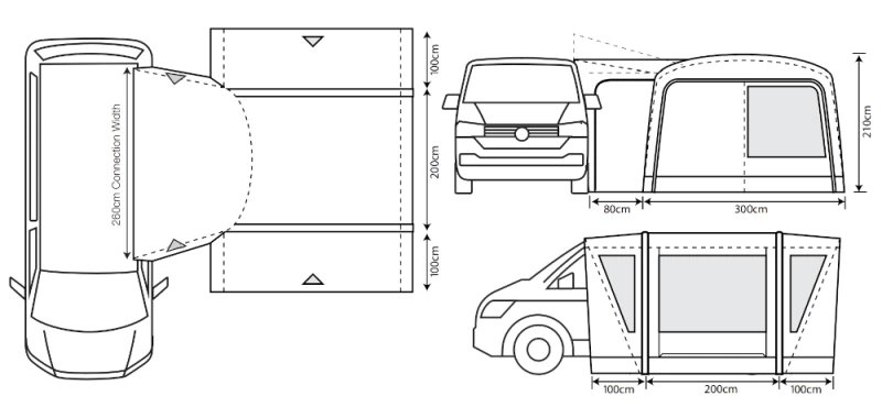 There are two different sizes for attachment with the most popular one being for VW sized vans (Lowline = 180-210cm) and the taller size fits nicely to motorhomes and high-line camper vans (Midine = 210-255cm). Crystal clear PVC windows offer plenty of light in the awning and toggle-up privacy curtains can be used to hide the contents of the awning when you drive-away.