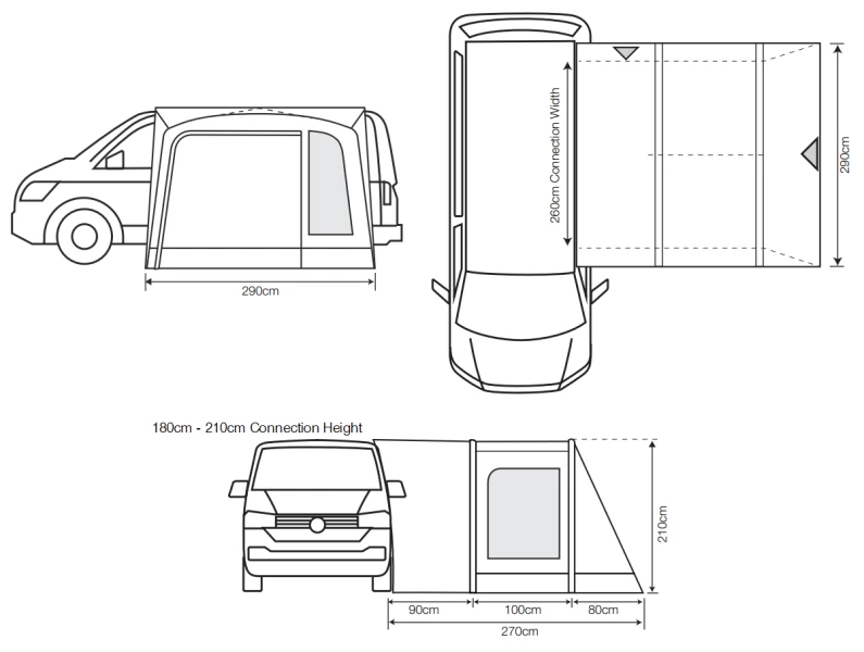 There awning only comes in the most popular size for VW sized vans (Lowline = 180-210cm). Crystal clear PVC windows offer plenty of light in the awning but toggle-up privacy curtains can be used to hide the contents of the awning when you drive-away.