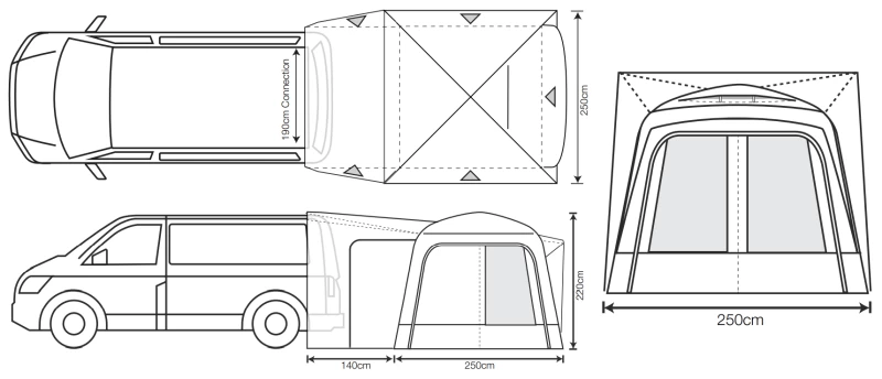 The Tunnel section of the Cayman can connect to a wide range of vehicles. With a connect height of 180-240cm it will happily fit most VW sized vans and even some larger panel vans. Along with the height the tunnel depth is 140cm so this can happily accommodate most tailgates and even barn doors (providing the material doesn’t catch the top of the door). The Cayman has two doors in the tunnel section which allows you to enter your van without going through the awning every time.