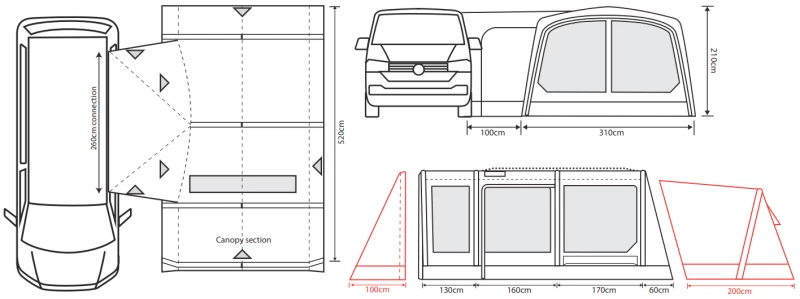 There are three different sizes for attachment with the most popular one being for VW sized vans (Low = 180-220cm), the taller size fits nicely to low-line motorhomes and panel vans (Mid = 220-255cm) and there is also a separate size for larger motorhomes (High 255 – 305cm). Crystal clear PVC windows offer plenty of light in the awning and toggle-up privacy curtains can be used to hide the contents of the awning when you drive-away. The tunnel section not only has two doors built into it (this allows you to access the van without going through the awning) but can also be adjusted to the correct connection height as there is an elasticated cord in the tunnel section so that you can get a better fit when you are on the lower connect size bracket, this also helps to get the best seal possibly against the elements.