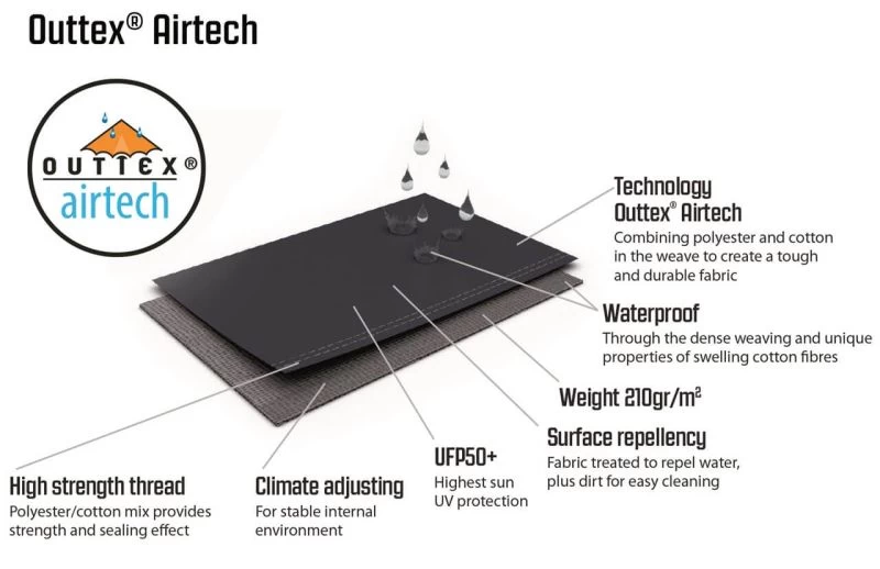 - Flysheet: Outtex® Airtech breathable Polycotton fabric (65% polyester / 35% cotton)