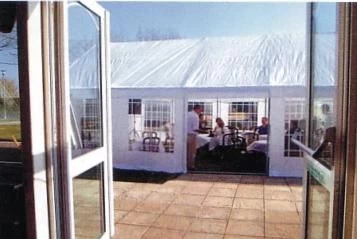 Party tents have vertical walls, enabling them to stand against buildings and give maximum use of the floor area. The vertical walls also allow two or more Party tents to be linked together using the optional gutters. For instance two 6×12 metre units will cover an area of 12×12 metres. These tents have a strong, easy to assemble 38mm diametre white powder coated steel frame (43mm on 6 metre models). Corner joints are 44mm diameter. The frame simply slots together and each leg comes complete with a base plate that can be pegged to soft ground or hard standing. The 6 metre models have extra roof braces to support the single span.