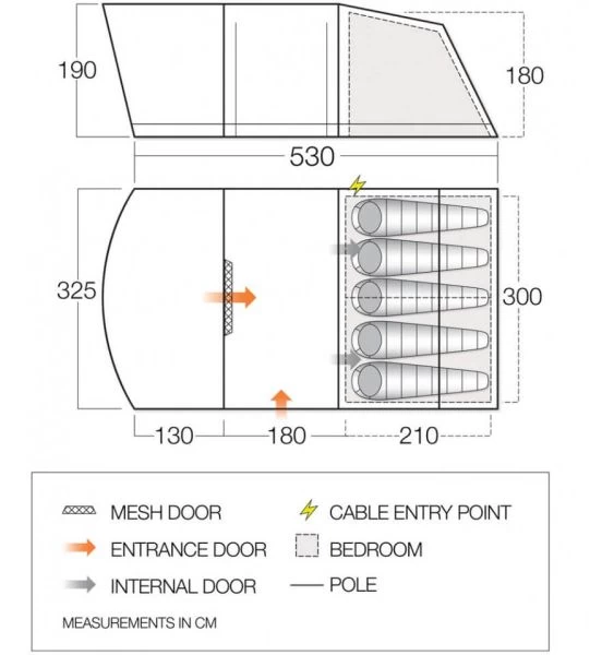Vango has manufactured a tent which is incredibly good value without any compromise on quality. You still have all of the main features built into the tent such as cable entry points, lantern hanging point, and mesh front door. The side door has the option to be used as a canopy by buying some king poles and has a drop-down door to alleviate and trip hazards in and out of the tent.