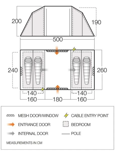 Vango have made a big improvement to their Sentinel fabric for the new season. This latest material has been dyed in a different method which not only increases the colour retention of the fabric but also the process uses 60% less water making it more eco-friendly. With a waterproof rating of 3,000mm HH, it is armoured with more than enough to cope with the typical British weather. The tent has key features such as dark ‘Nightfall bedrooms’ which enable you to have a longer and better night’s sleep as you won’t be waking up when the sun does. Inside the bedroom there are also storage pockets to give you an easily accessible point for storing items like phones or torches so you can find them in the middle of the night. Other important features include cable entry points, privacy curtains, mesh windows internally and low-level panels externally; one of our favourite features is the drop-down doors. Unlike previous years Vango have added extra toggle points to the lip to decrease the chance of the wind from coming in.