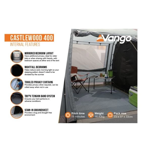 The Vango Castlewood is based on the classic “vis-à-vis” design that campers have known and loved for many years. With sleeping compartments at either end of the tent, this layout means that you should hopefully get a better night’s sleep with the kids/guests as far away as possible! Ultimately you also benefit from having more privacy as everyone needs their own space sometimes, especially when camping. The Castlewood is available in two sizes, a 4 berth is ideal for smaller families or even for festivals whereas the 8 berth suits more the larger families or scout/guides who want to accommodate a large amount of people in one tent.