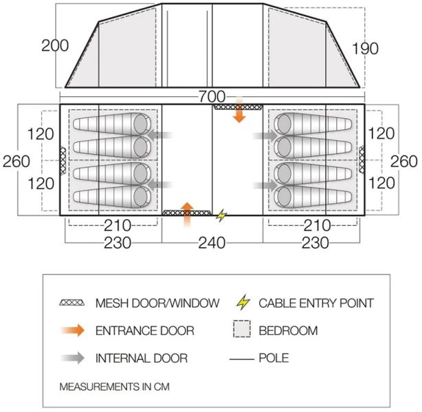 A central living area brings everyone together and because there are doors on both sides of the tent you can pick and choose which is your main entrance depending on what the weather is doing. The main doors also feature a mesh panel which can be covered by zipping up the privacy curtains allowing you the option to increase airflow without having to allow inspects to join the party. The doors can also double up to be a canopy by buying some king poles and pulling it out. If more space is required, then an optional TA003 side awning can be purchased and often creates an area to cook or clean off before entering your lovely new tent.