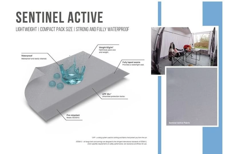 - Sentinel Active Fabric – When pack size and weight are the key influencers in choosing your awning, our specifically designed Sentinel Active fabric will surpass your needs. Sentinel Active is strong, whilst being fully waterproof with a rating of 3,000mm HH, ensuring great quality and performance coupled with compact pack sizes