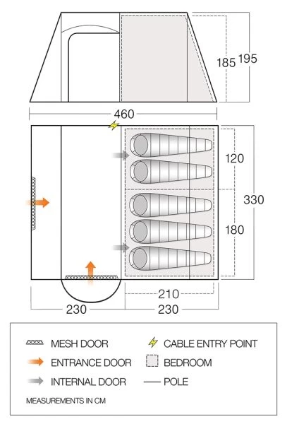 The Osiris has a varied number of features such as Dark ‘Nightfall Bedrooms’ to stop you waking up when the sun does, two mesh doors leading out of the living area which helps to keep insects out. Vango’s PowerFlex Fibreglass Poles have pre-angled ferrules to increase height and allow furniture to be moved closer to the edge of the tent, by having fibreglass poles it allows the tent to be light in weight but strong & reliable. The tent has Crystal Clear windows to allow plenty of light into the tent while toggle up curtains give privacy as and when needed and a flexible door step which can be flattened for push chairs or raised for keeping the elements out.