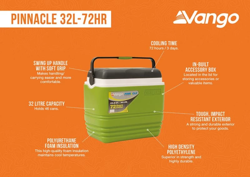 The Vango Pinnacle 32L cooler is the perfect addition to any day out or camping trip to keep your drinks and snacks cool. Able to hold 46 cans or 6 two-litre bottles upright, you are sure to fit everything in. Insulated with polyurethane foam, it will stay cool for up to 72 hours. Added features include a soft grip carry handle and lid compartment to keep your belongings safe.