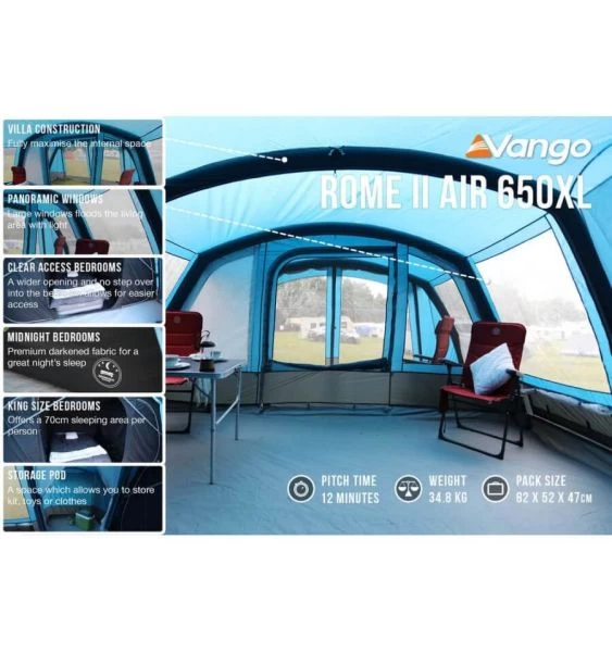 Due to the lightweight Eco Dura Fabric, it means that the weight of the tent is only just over 31kg which is impressive when you think how big it is. The Rome Eco couldn’t be easier to pitch thanks to Vango’s S.I Pro (Single Point Inflation); simply peg out the base of the tent, pump it up from one point (or let an electric pump do it for you) and guy the tent out. This whole process has been demonstrated by Mike in our own YouTube videos (as seen in the link below). Even though the tent can be pumped up from one point it has multiple deflation points to make packing away the tent a doddle; this is also helped by the Smart Pack Bag which gives you the option of compressing the tent before zipping it into the bag.