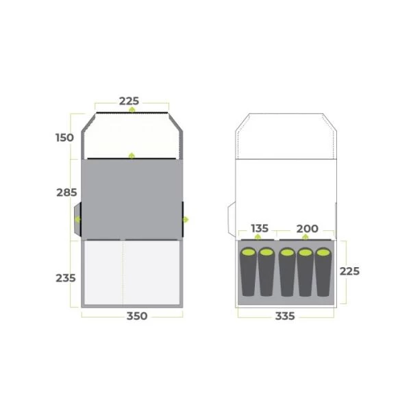 - Window Features – Adjust internally, Tinted PVC, 3 Way Windows, Side Zipped Internal Windows Covers, Internal Window Gussets, Rear External Window Covers for Additional Shade, Bug Proof Mesh