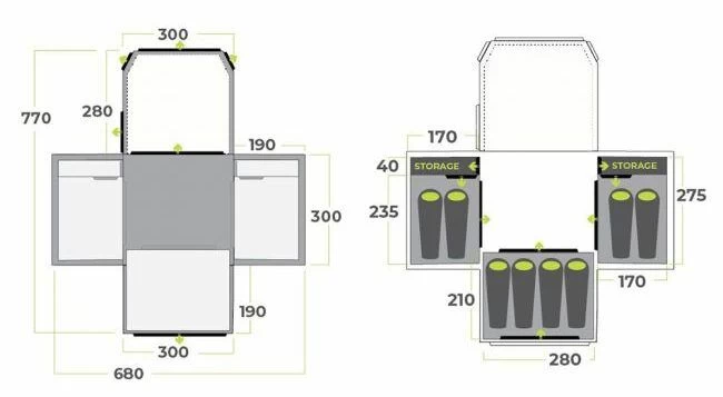 - Awning Features – 3 Stage Door, Awning Poles Included, All-Weather Access, Extended Awning Area, Roll Up Awning Door, Removable Anchor Webbing, Rain Skirt Fold Away Toggles, Rain Skirt, Gullwing Awning, Twin Access Awning Doors